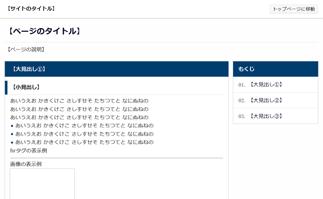 - 上記の画像をクリックすると、「ホームページ(HTML)テンプレート素材」のサンプルページが表示されます。